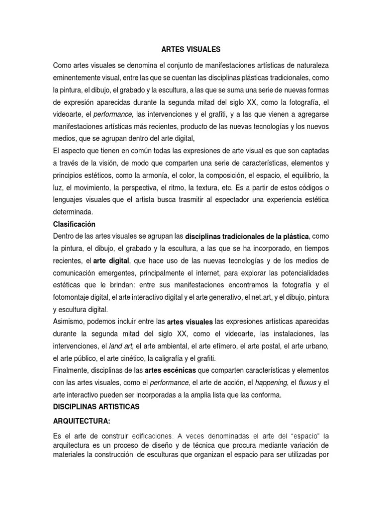 La denominación artes plásticas surgió en el siglo xviii para designar el dibujo, la pintura, el grabado, la escultura, la cerámica y la arquitectura, . La definición de esta locución es la rama del arte que incluye a un conjunto de disciplinas artísticas de naturaleza eminentemente visual que facilitan la . Dentro de la denominación de las 7 bellas artes, las artes visuales fusionan elementos provenientes de: El concepto artes visuales se gesta a fines de la ii guerra mundial, cuando los artistas europeos que habían emigrado a new york asientan una producción . "arte" es un término que se refiere a las creaciones .